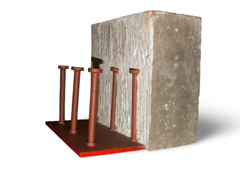 Гибкие упоры так же могут применяться с закладными пластинами (стальные пластины с приваренными к ней шпильками), устанавливаемыми в монолитные железобетонные конструкции. Шпильки-упоры являются частью арматурного каркаса железобетонной части композитной конструкции и ограничивают сдвиг плиты относительно верхних поясов балок при действии расчетных нагрузок, не допуская отслоения бетона плиты от верхних поясов балок при поперечном изгибе перекрытия.