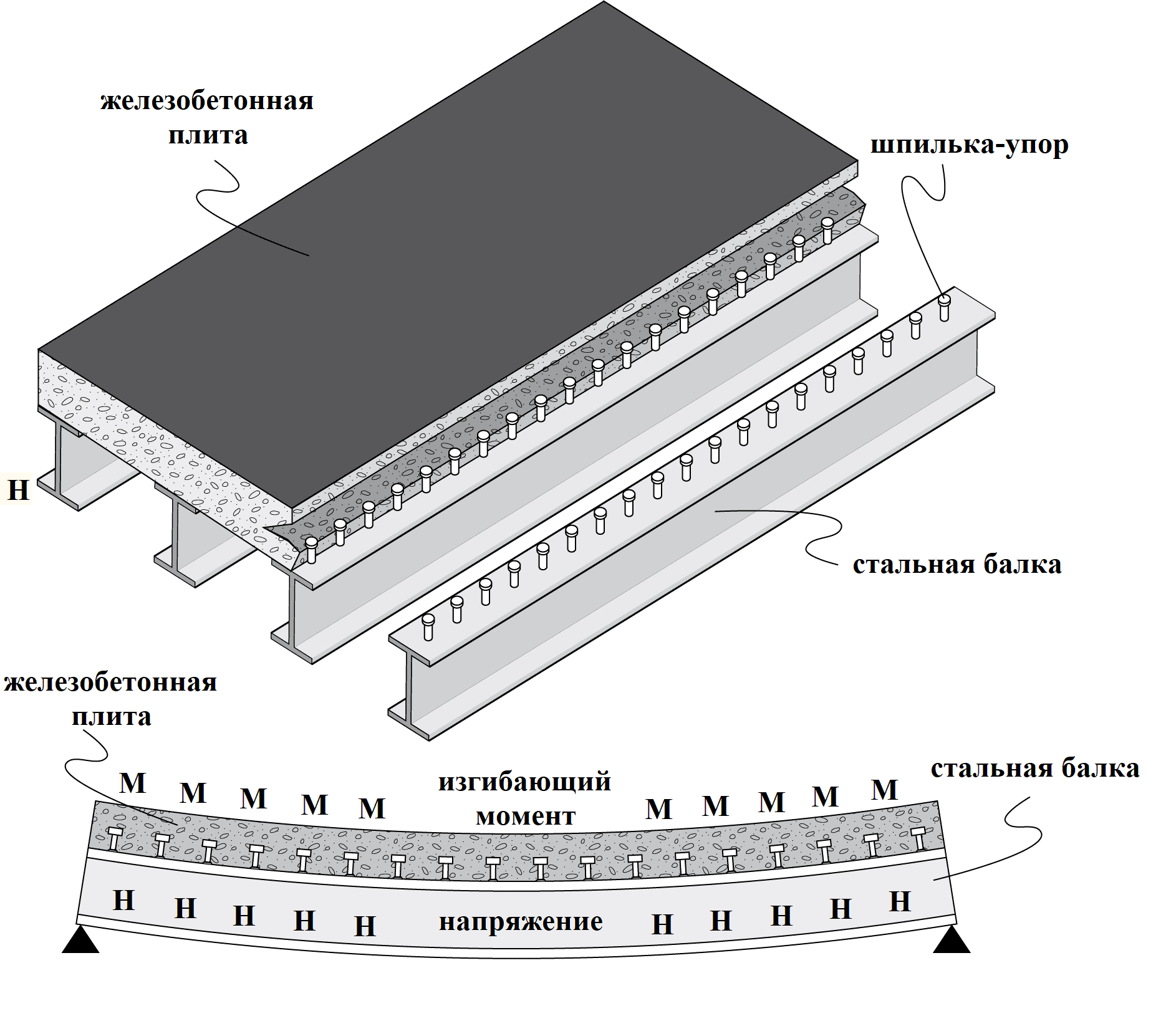 Примечание: искривление комбинированной балки значительно преувеличено для наглядности