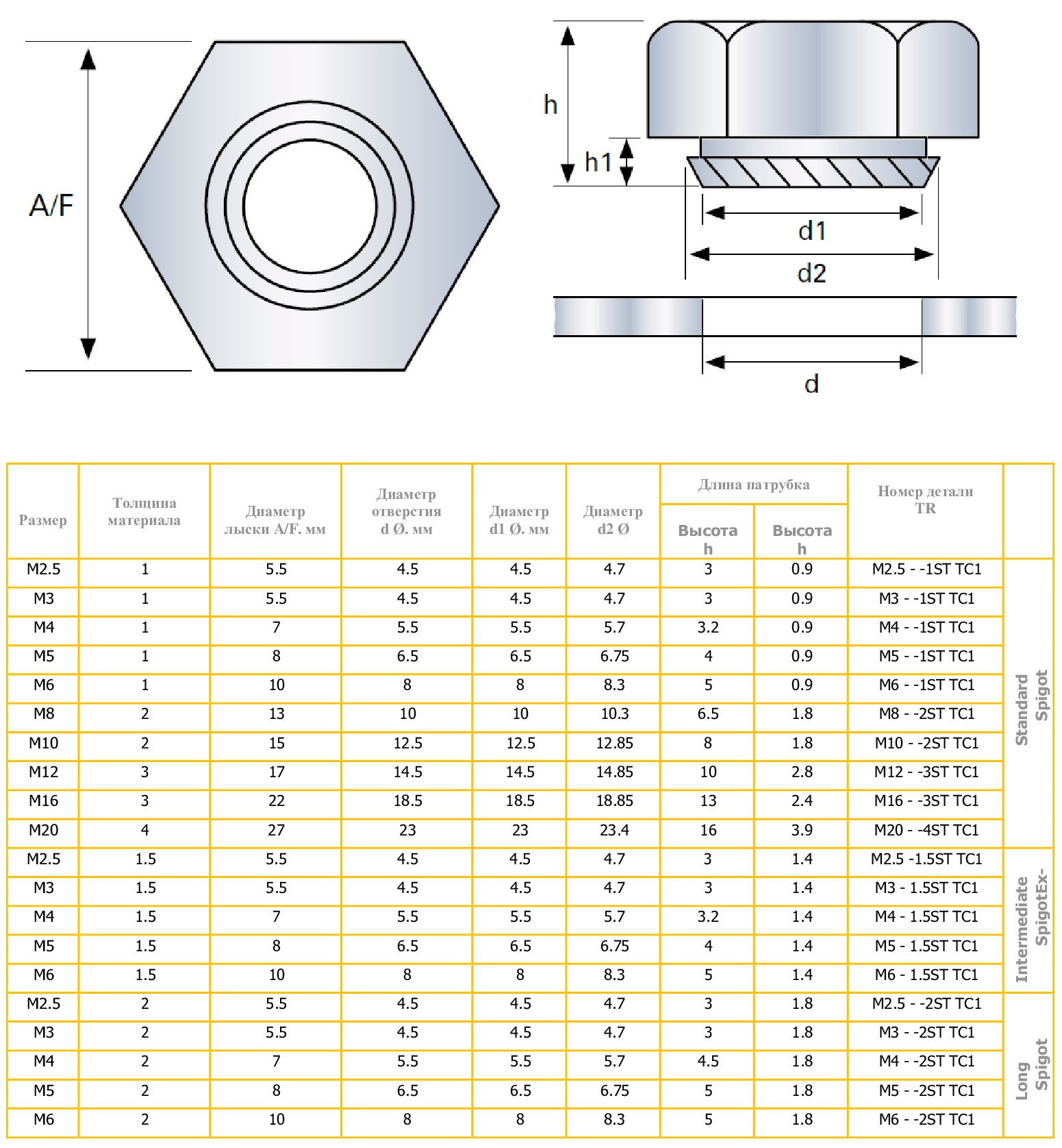 Запрессовочная гайка усиленная шестигранная тип K-NUT из оцинкованной углеродистой стали, углеродистой стали или нержавеющей стали, благодаря усиленной конструкции и шестигранной головке имеет повышенную несущую способность и сопротивление крутящему моменту. Оцинкованное покрытие и исполнение из нержавеющей стали продлевает срок службы гайки, повышая ее устойчивость к коррозии. Применяется для создания резьбового соединения в листовых металлах и некоторых видах пластика. Размерность от М3 до М20. В зависимости от размерности предназначена для монтажа в заготовки толщиной от 1 до 4 мм (с шагом 1 мм).