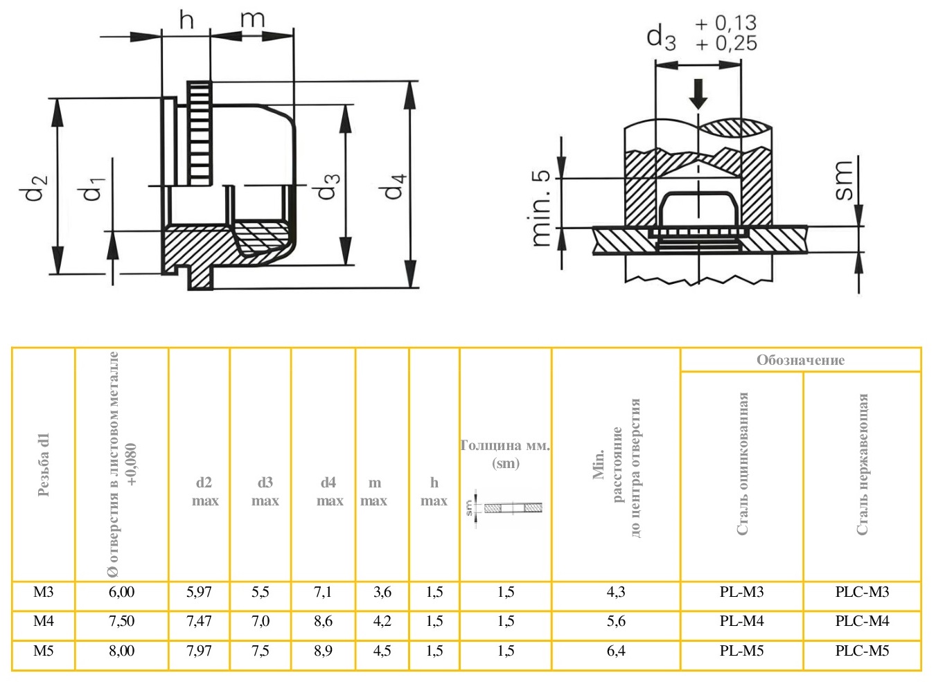 Самоконтрящаяся (самостопорящаяся) запрессовочная гайка с нейлоновой вставкой тип PL из оцинкованной закаленной углеродистой стали. Оцинкованное покрытие продлевает срок службы гайки, повышая ее устойчивость к коррозии. Нейлоновая вставка предотвращает износ и повреждение резьбы при многократном монтаже и демонтаже винта, а так же повышает устойчивость к вибрационным нагрузкам и не ослабляет резьбовое соединение в процессе эксплуатации. Температурная стойкость вставки до 120 °C. Размерность от М3 до М5. Рекомендуется для монтажа в стальные и алюминиевые заготовки твердостью до HRB 70 и толщиной от 1,0 мм.